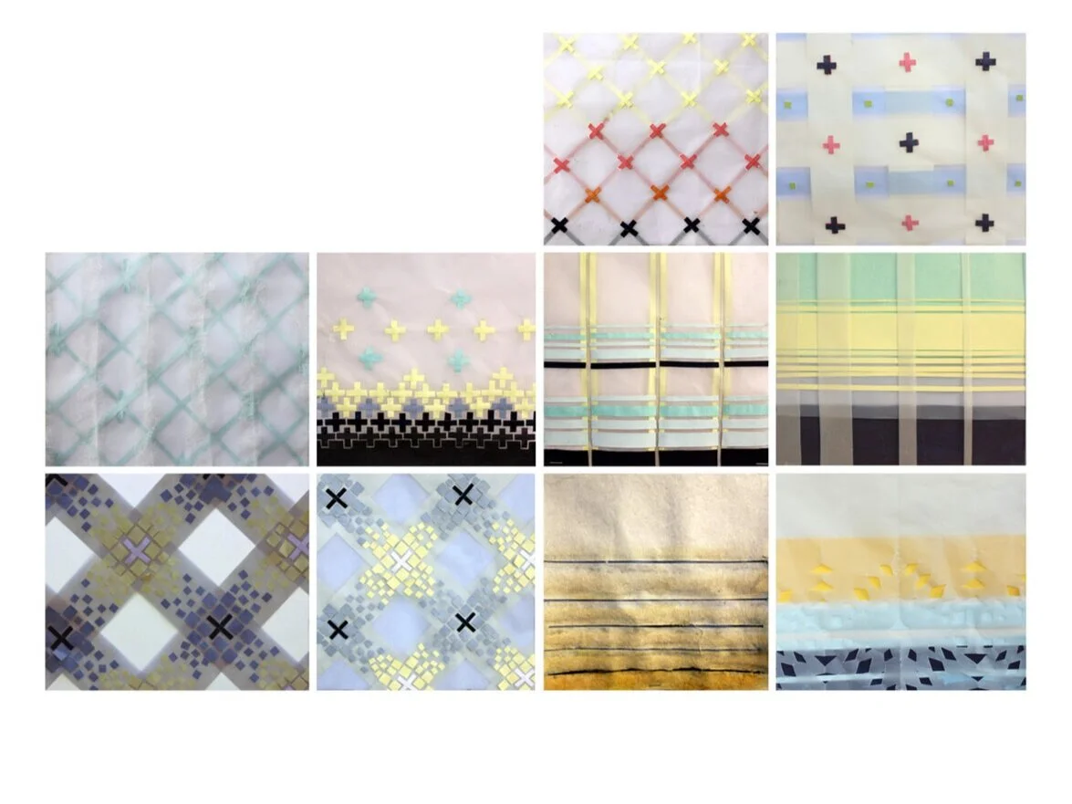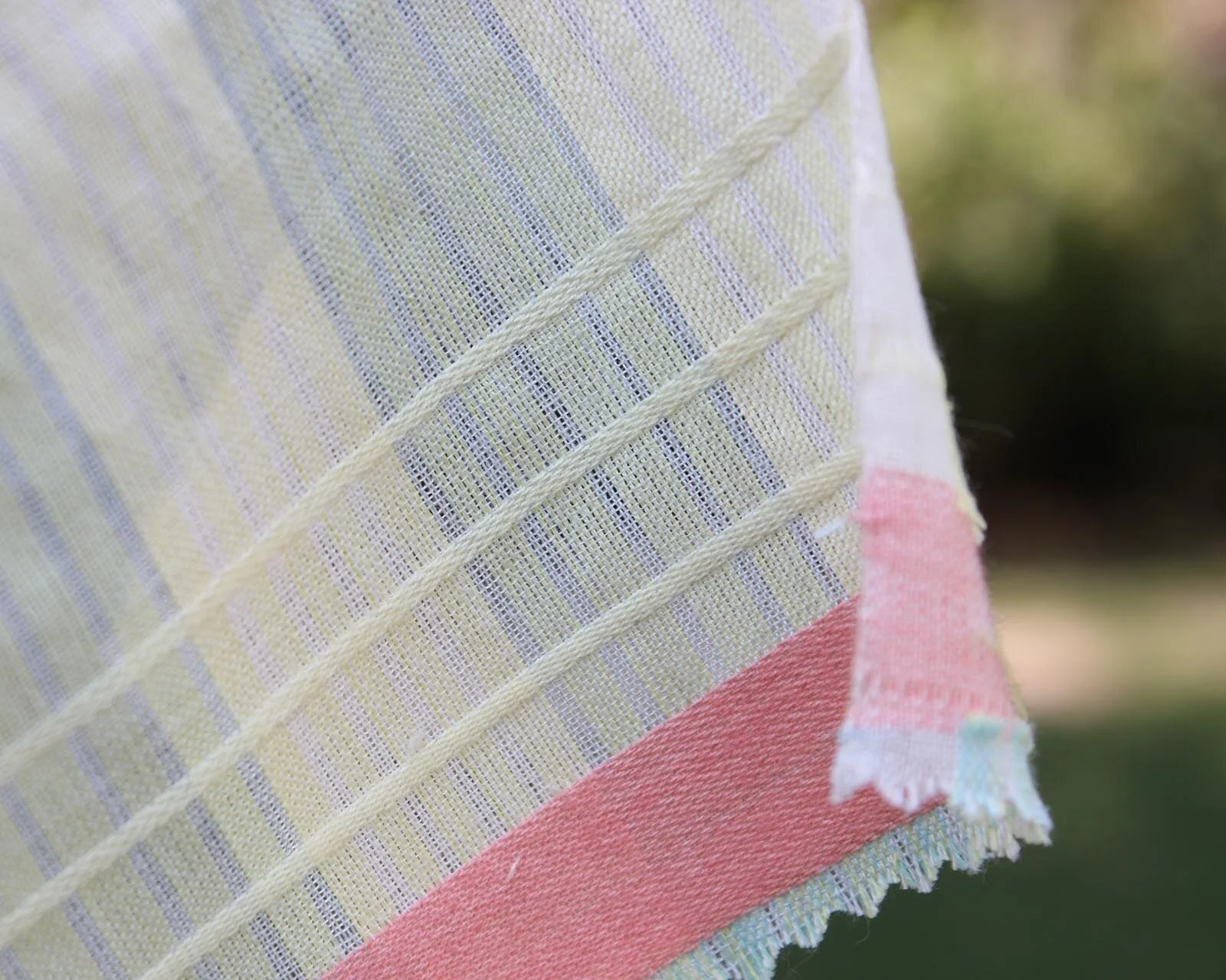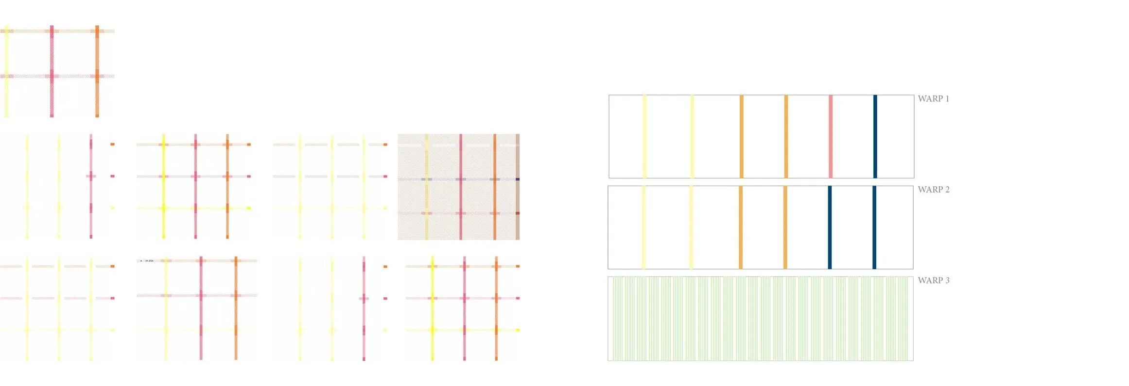 The warp went through 3 iterations of warp rhythms of hand dyed cotton and silk yarns. Some little details have been added by handpicking in a few swatches .