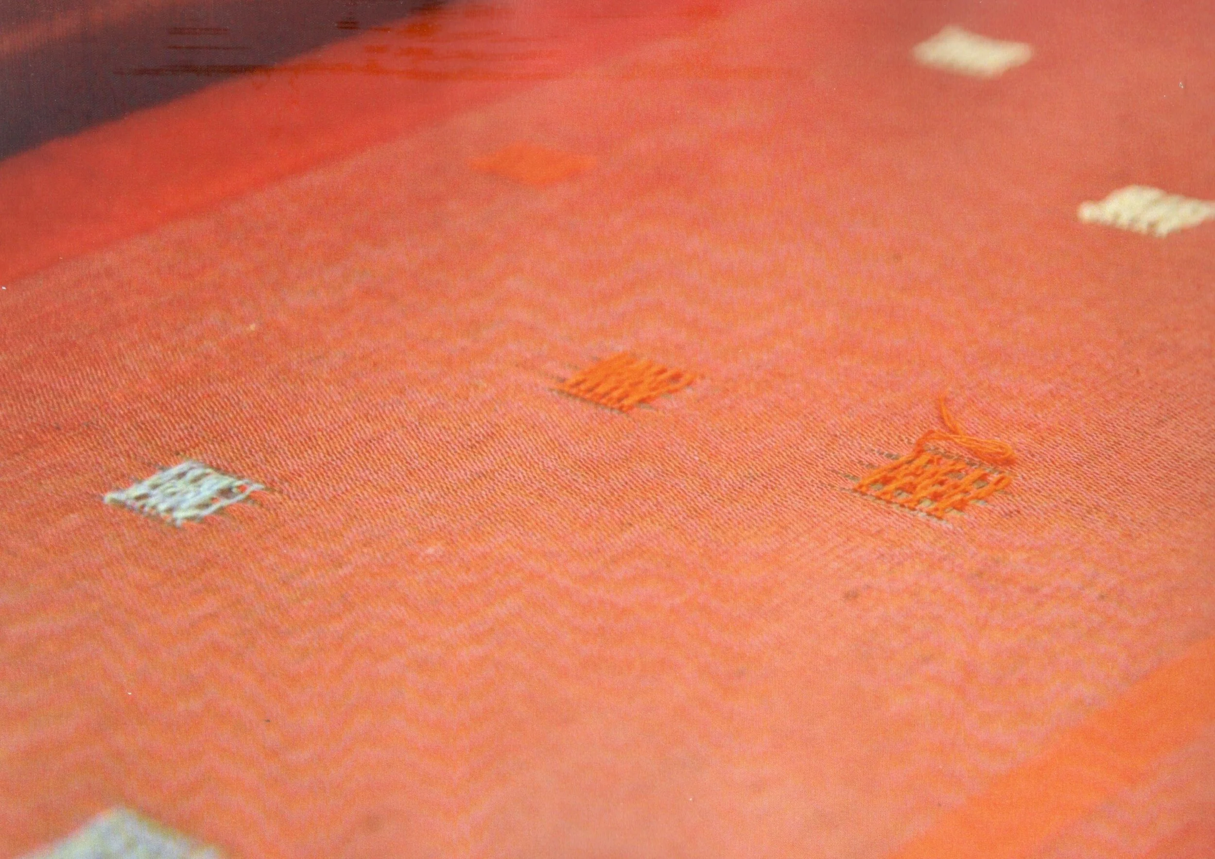 Fabrics handwoven by Gopal dada from the first warp rhythm on the studio loom. The warp here is a bright red and is woven with highlighting colors of cotton, silk and linen yarns.